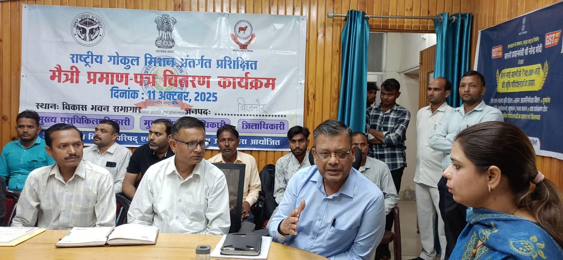 बिजनौर, राष्ट्रीय पंचायत ब्यूरो। जिलाधिकारी जसजीत कौर ने शनिवार को कलेक्ट्रेट स्थित एनआईसी कक्ष में राष्ट्रीय गोकुल मिशन अन्तर्गत प्रशिक्षित मैत्री को उत्कृष्ट कार्य के लिए प्रमाण पत्र वितरित कर सम्मानित किया। इस अवसर पर कृषि विभाग द्वारा नामित किये गये 10 किसानों को उन्नत नस्ल के बीज निःशुल्क वितरित किये गये।