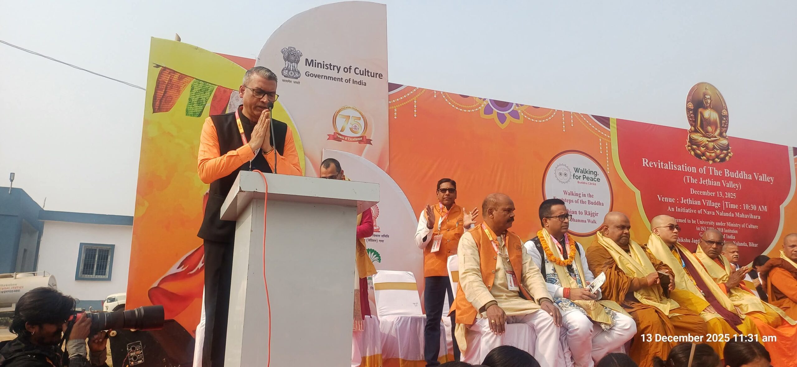 नालंदा (13 दिसम्बर 2025) : प्रत्येक वर्ष की भांति इस वर्ष भी नव नालन्दा महाविहार (सम विश्वविद्यालय, संस्कृति मंत्रालय, भारत सरकार) द्वारा जेठियन–राजगीर धम्म यात्रा का आयोजन किया गया, जिसमें नव नालंदा महाविहार के शिक्षकों, कर्मचारियों, छात्र-छात्राओं, नव नालंदा महाविहार में अध्ययनरत भिक्षु–भिक्षुणियों के अतिरिक्त श्रीलंका, नेपाल, बांग्लादेश, वियतनाम, म्यांमार, थाईलैंड, कंबोडिया, अमेरिका, जापान, चीन, लाओस आदि देशों से आए बौद्ध श्रद्धालुओं एवं भिक्षुओं ने सहभागिता की ।
