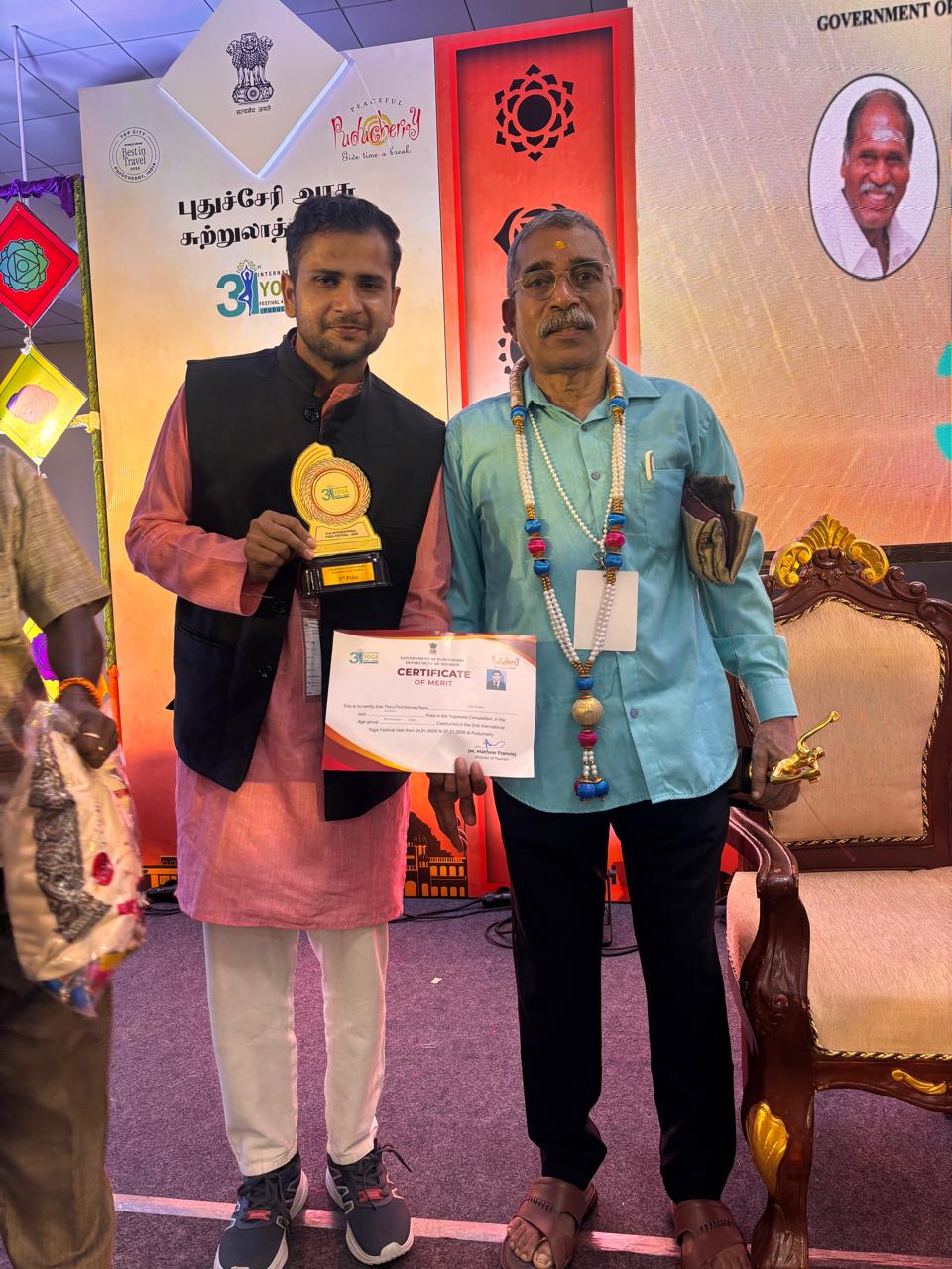 प्रतियोगिता में 28–35 आयु वर्ग में उत्कृष्ट प्रदर्शन करते हुए अनुज कुमार (योगी) ने कांस्य पदक (तृतीय स्थान) प्राप्त कर क्षेत्र व विश्वविद्यालय का नाम रोशन किया। पुरस्कार वितरण समारोह में पुदुच्चेरी सरकार के पर्यटन मंत्री श्री लक्ष्मी नारायण ने अनुज योगी को प्रतीक चिह्न एवं प्रमाण पत्र प्रदान कर सम्मानित किया।